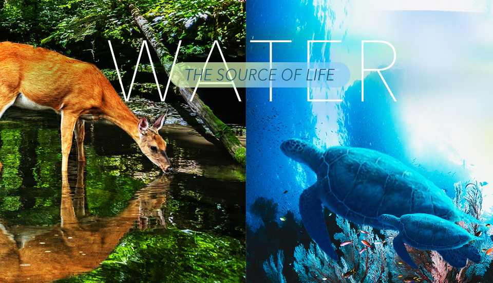 The top image expresses the importance of water by showing that both terrestrial and underwater organisms cannot live without it.